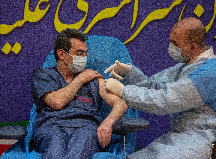 2月9日,在伊朗德黑兰,医务人员为接种者注射新冠疫苗。(新华社发,艾哈迈德·哈拉比萨斯摄)